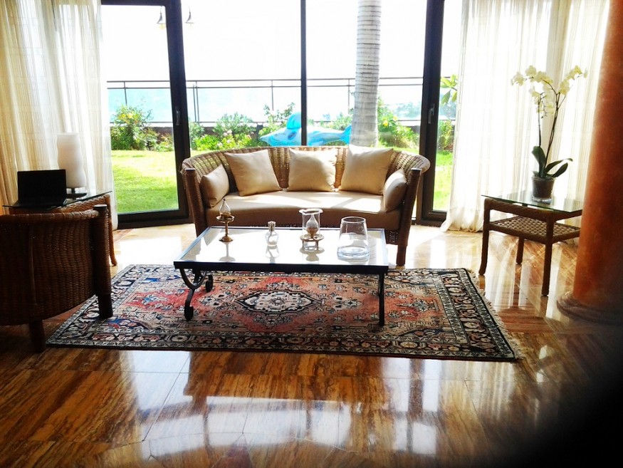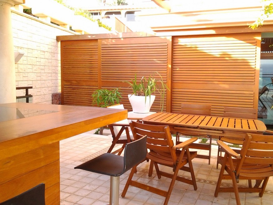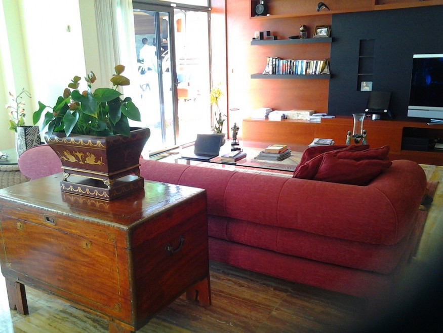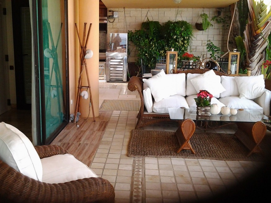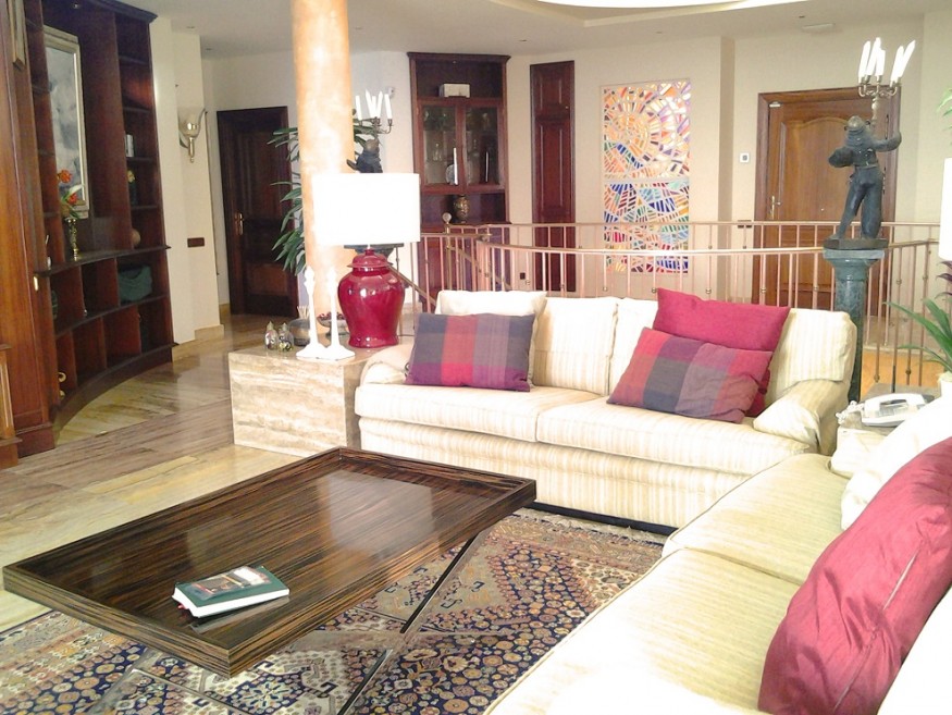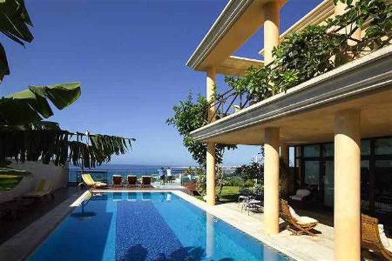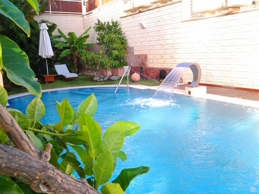 The Villa has 800 m built in three levels. - Basement: Has a warehouse, a lounge of games with a billiards and a table of Ping-Pong and some devices of gymnastics, a bathroom, has apart the bedroom of service with a small room deestar and built-in bath, also this zone of washer and wringer and the quarter(room) of machines of swimming pool and air. 1 º Floor: We find a large living room of 150 m, full equipped kitchen, toilet for the swimming pool. This floor is placed at a height of(the level of) the swimming pool and garden where we can find the porch, Jacuzzi and a fountain. Great garden of 450 m, we have under the solarium a bath and a sauna for about 6 persons, in the garden also have, a senator equipped with plate, fridge, sink and BBQ. 2 º Floor: Living-room of approx. 50 m, principal bedroom with dressing room and bath in - suite, one bedrooms with twin beds and 1 bath in suite, two more double rooms with a bath. These 2 bedrooms, they share a terrace with a nice view to the sea, with a small office with small fridge. The Villa has air conditioning. Solar panels to warm the water of the whole house, . Service cleaning during the week.