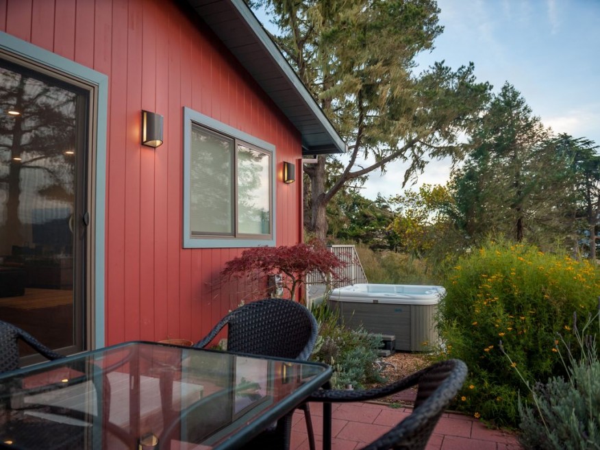 Brynant Cottage provides you with ample outdoor space to enjoy in all seasons. Enjoy your morning coffee, or an evening glass of local wine on one of two decks leading off the bedrooms and main room. Sweeping views of the water await you, and there is a comfortable lounge area to settle into. There is no better place to watch the sun sink behind the Marin headlands (easily accessible for hiking!) than Brynant Cottage. Enjoy the gardens surrounding the home in the summer months from this perch. On a winter evening step outside under the star filled sky and enjoy a soak in your own private hot tub, an added bonus of Brynant Cottage