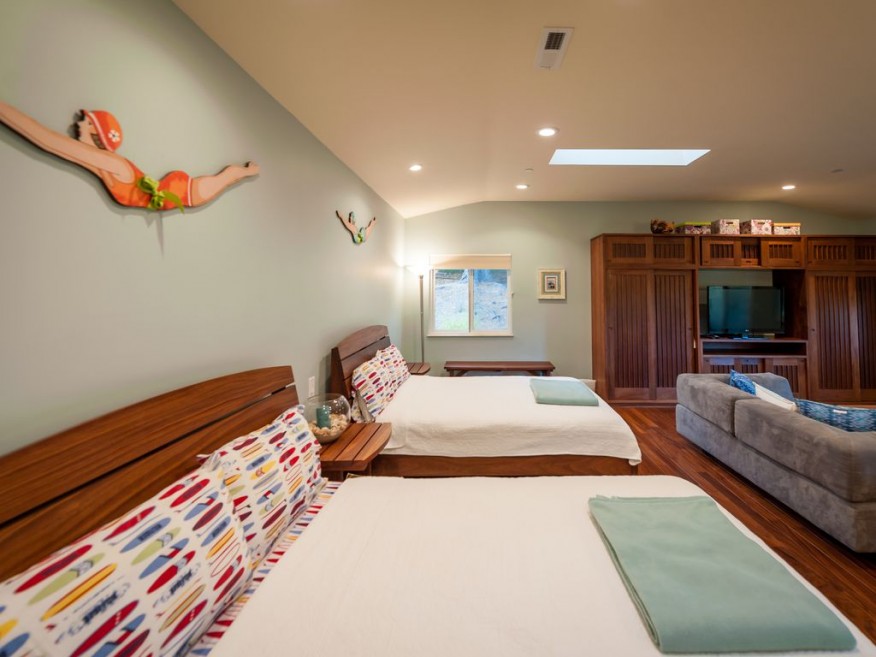 At 1500sq feet the cottage is bright and spacious, while still feeling cozy. Beautiful hardwood floors are laid throughout the home . Snuggle up in the main living room, the heart of the home, on the wrap- around couch and enjoy the wood stove while watching a movie on the state of the art entertainment system complete with satellite tv. The open concept design of Brynant Cottage means the main seating area flows seamlessly into the modern kitchen keeping conversation going while lunch or dinner is prepared. The kitchen is complete with new stainless steel appliances and ample lighting. The drawers and shelves are stocked with all the tools of the trade you need to prepare a meal using California’s incredible range of fresh and local ingredients.. The large wooded family table comfortable seats eight people.