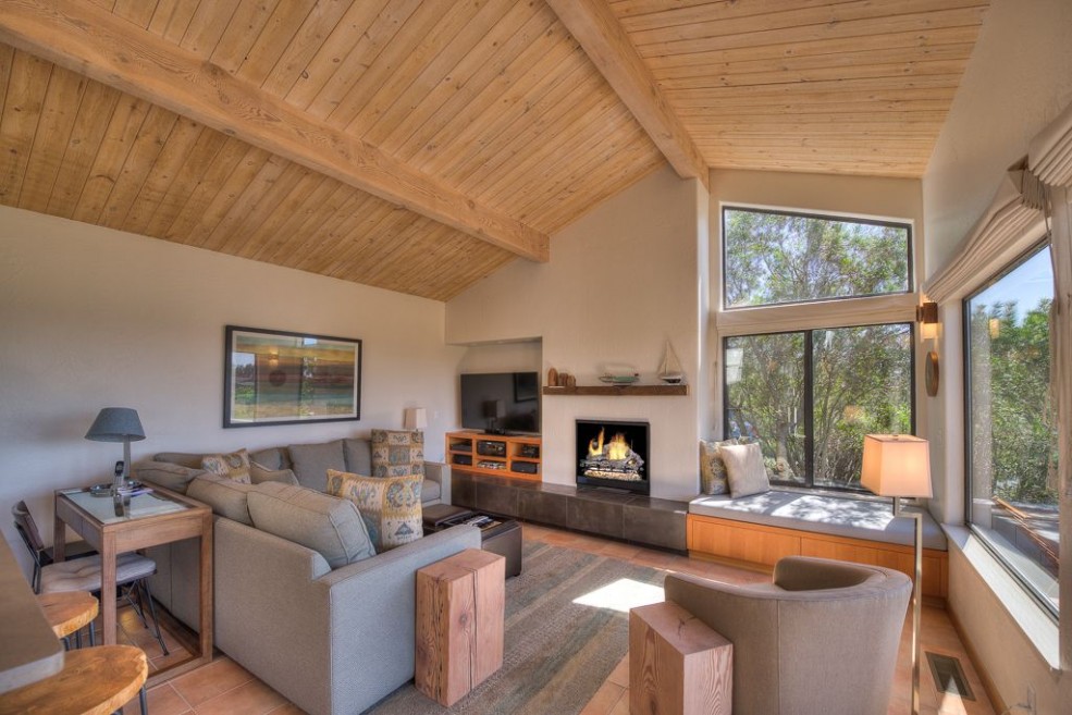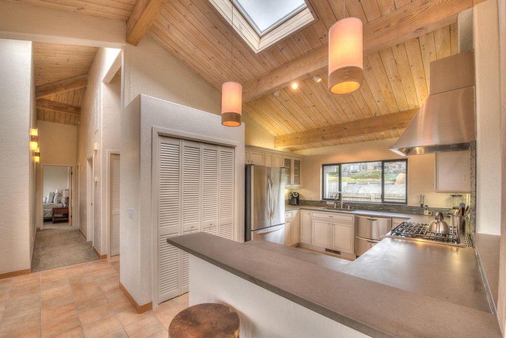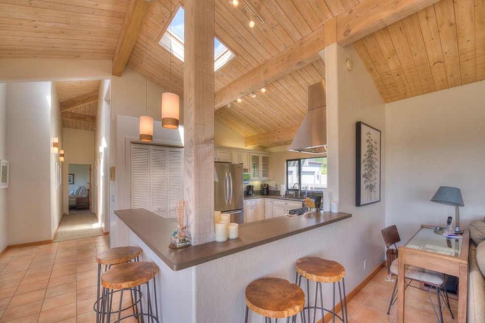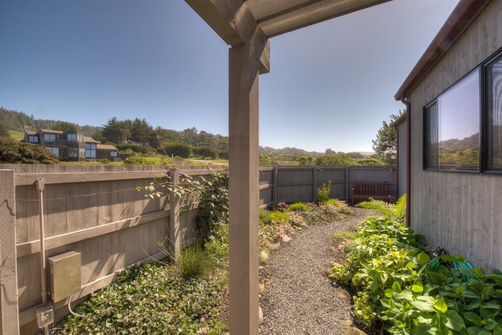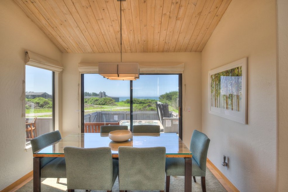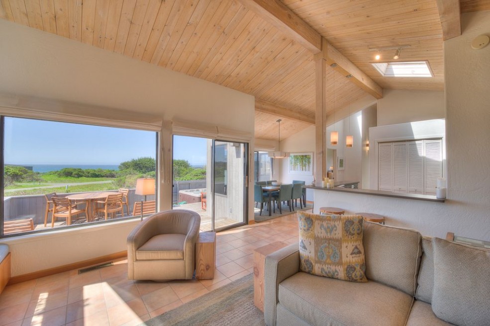 The Odyss-Sea was recently remodelled with interior design and planning done by Gayle Forster. She has created a warm and inviting atmosphere inside to compliment the beauty of The Sea Ranch landscape outside and make your stay most memorable. Almost everything in this home is new – appliances, furnishings, lighting, and much more. The kitchen is a chef’s delight and offers views of the hillside as well as the ocean. The living room features an entertainment centre with internet access, gas log fireplace and window seating as well as a desk where you can work and watch the ocean. The living and dining rooms have large windows with ocean views and several skylights providing a bright, cheery atmosphere. Walk out onto the deck facing the ocean and enjoy a glass of wine with friends or a soak in the hot tub. The master bedroom has a king bed and access to the deck and spa. Guest bedroom #2 has a queen bed and bedroom #3 has twin beds. The front door and landscaped entryway area near the detached garage is protected by a covered breezeway.
