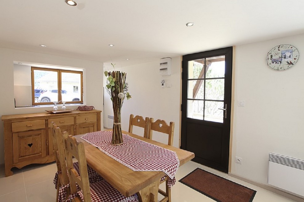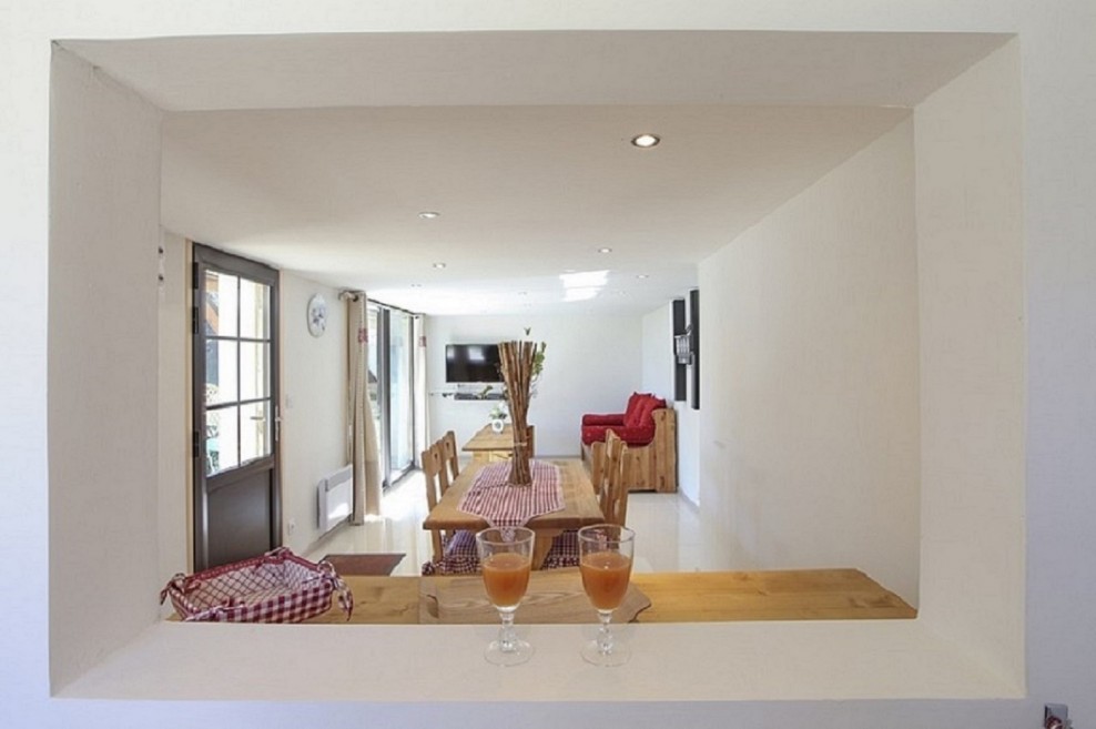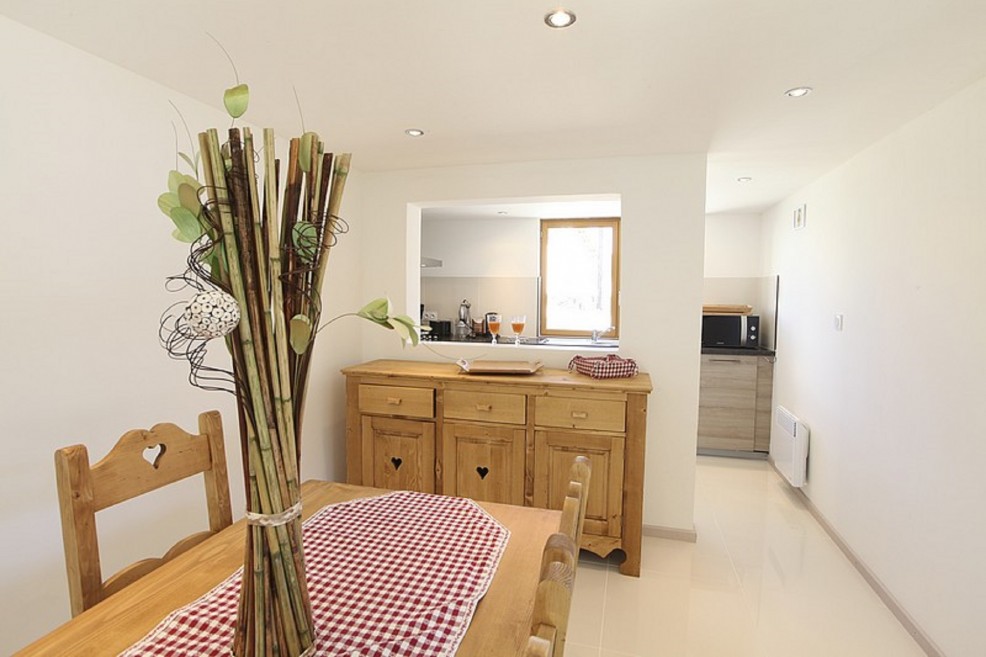 The kitchen includes fridge freezer, ceramic hob, oven, microwave and substantial storage to find all the necessary utensils dolce gusto coffee machine, necessary for fondue and raclette. The kitchen communicates directly to the dining area with a cabinet opening from both sides.
