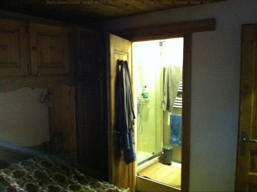 You enter the apartment through a corridor leading to the left a room overlooking the corridor with double bed and desk. This room has a private shower. In front of the room there is a large closet for clothes and ski boots, and another closet or are a washing machine and a dryer. Then there are toilets for the lower level and opposite is the staircase leading to the upper level.
