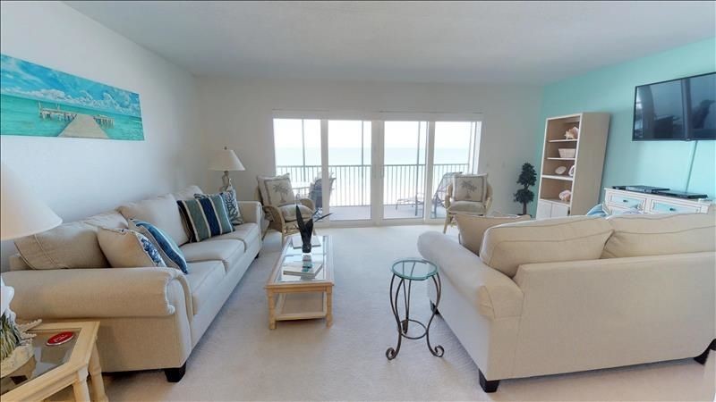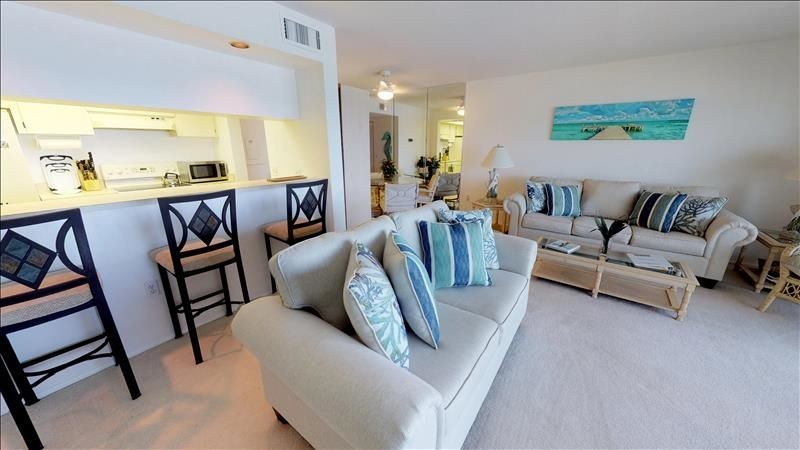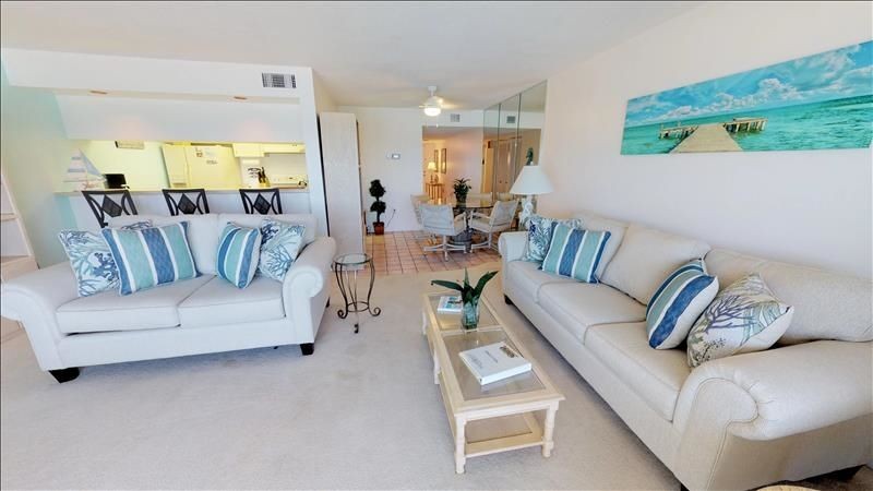 This direct gulf front condo features two bedrooms and two baths that sleeps 6. The master bedroom suite has a king size bed, a queen in the second bedroom, and a queen sleeper sofa . Full kitchen and laundry in the unit. Private access to the beautiful white sandy beach, heated swimming pool and reserved covered parking. Sunset 207 is walking distance to the free trolley ride, village and restaurants. Come and enjoy the early mornings on the lanai and unwind with the sunsets.