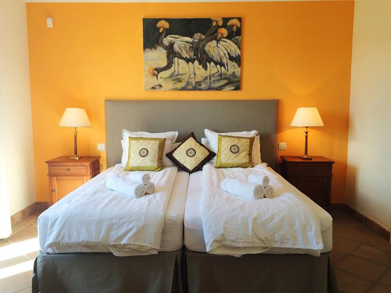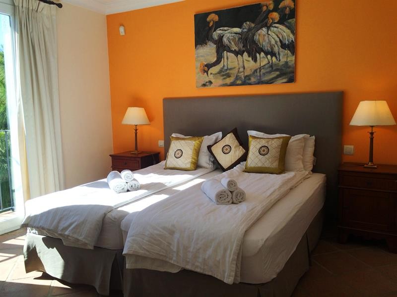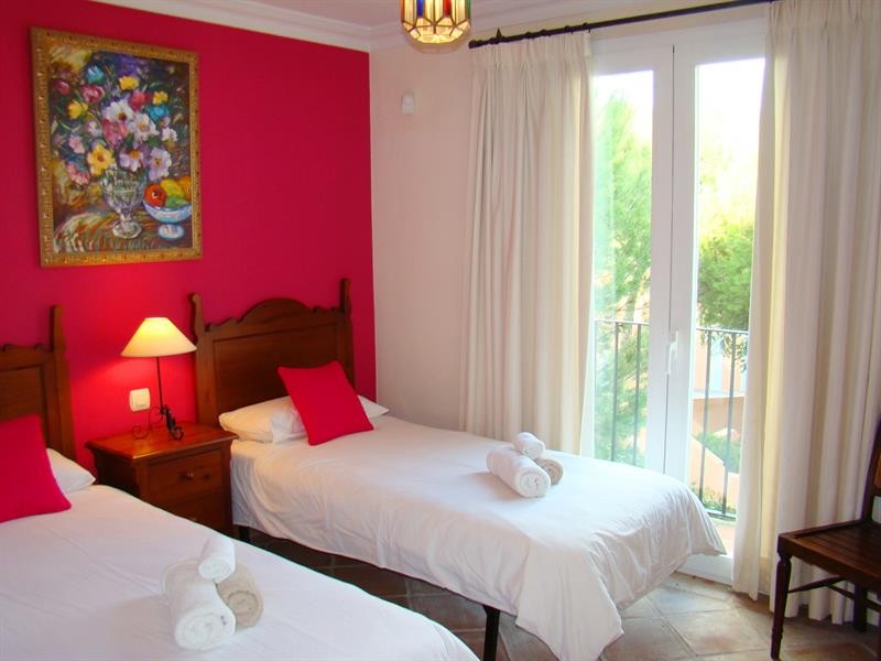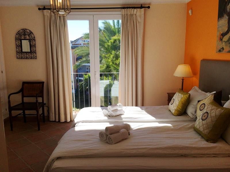 Beside the living room you will find the downstairs bedrooms, both spacious, equipped with single beds, built-in wardrobes and en-suite-bathrooms with underfloorheating and windows. The beachside bedroom is bigger and offers nicely pool- and seaviews.