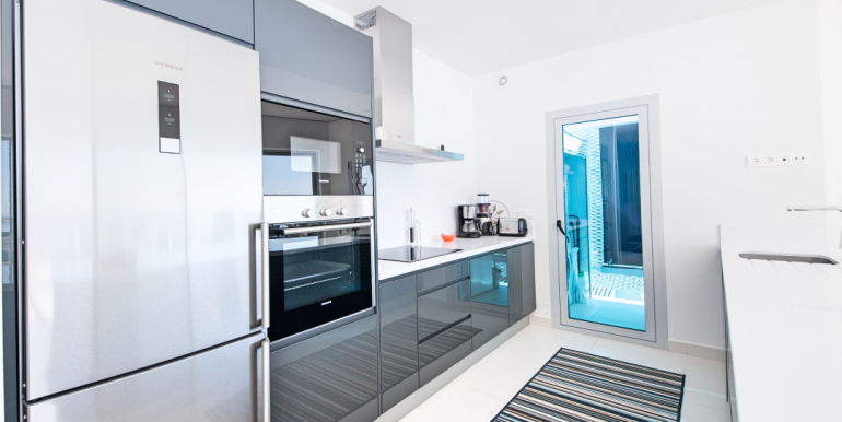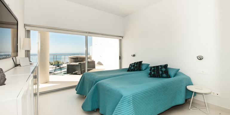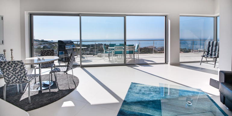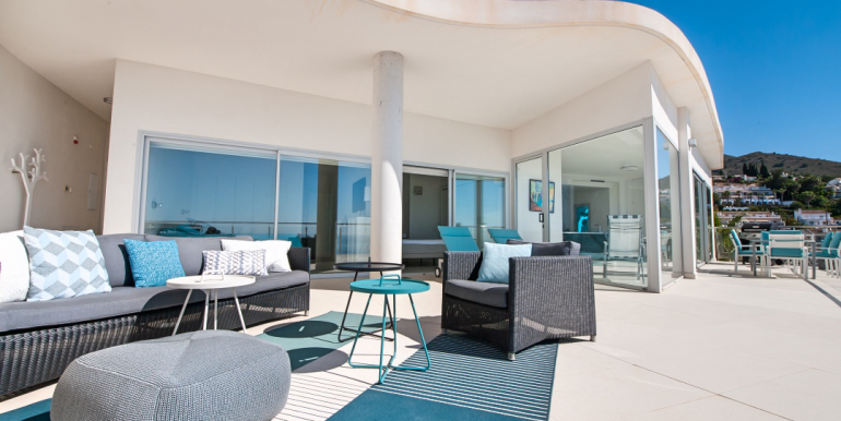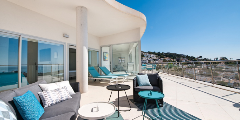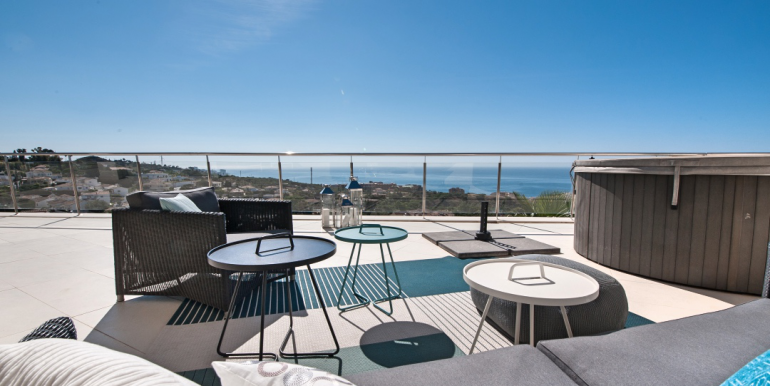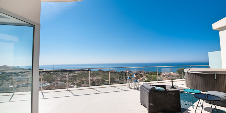 This stunning Penthouse is the perfect setting for a good holiday on the sunny coast. The accommodation is decorated in a high standard and tasteful style. The house is lovely light with large glass parties inviting the sun and the light inside. The accommodation contains a lovely open fully equipped kitchen. Nice bright living room with access to the 95 m2 terrace. 2 bedrooms with fitted wardrobes. 2 beautiful bathrooms. On the large terrace you have a great view of the Mediterranean and the coast, the terrace is also equipped with lovely terrace furniture and sunbeds as well as not to forget a beautiful jacuzzi. The accommodation has fully integrated hot / cold air conditioning. WIFI / internet is available in the residence. Private parking is available for the accommodation. The complex has 3 swimming pools for free use.
