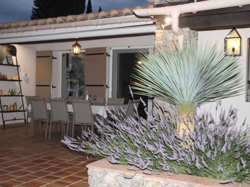 Beautiful Mediterranean garden with shaded terraces and outdoor dining furniture