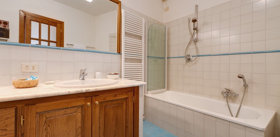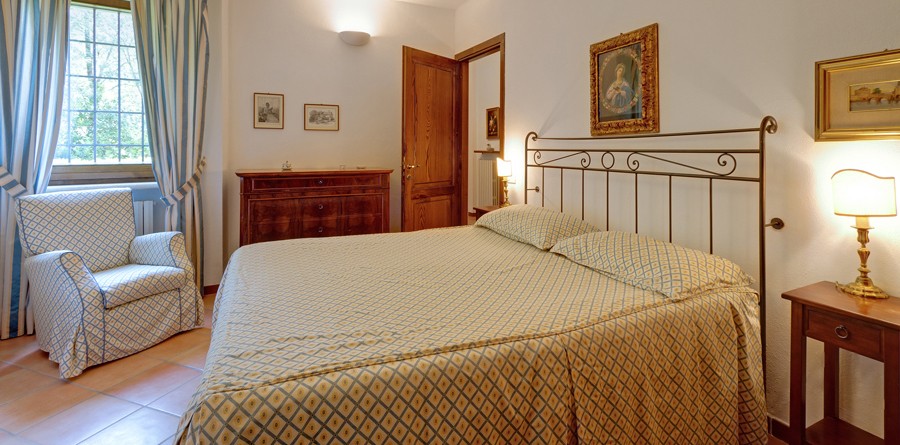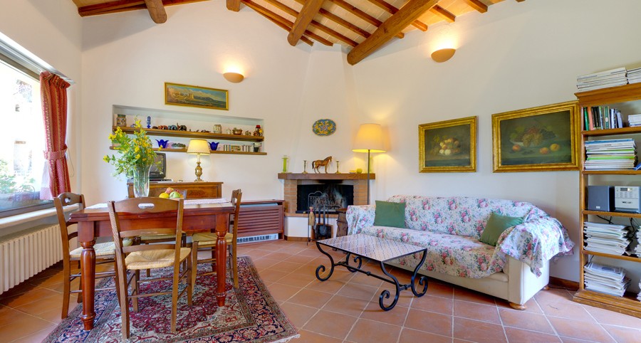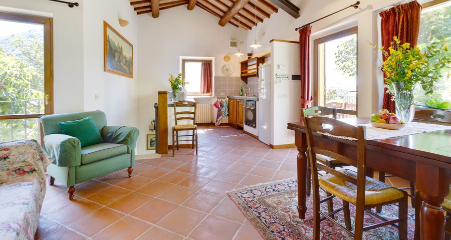 It is a two floor house with a private garden. At the first floor, with a terrace, there is the living/dining room with fireplace and kitchen. At the ground floor there are two bedrooms (one double room) with two bathrooms. From the ground floor you access to the private garden, sunny all day. From the "Casetta" you can enjoy a beautiful panorama of mountains and woods.