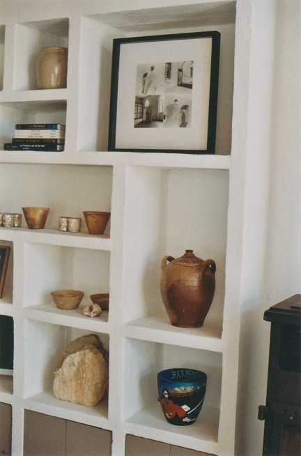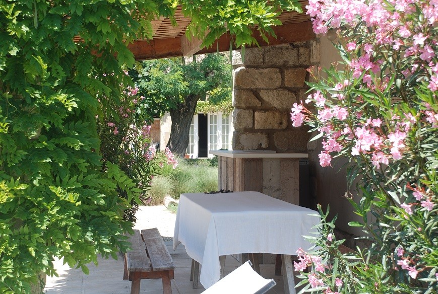 Large outdoor terrace with gas BBQ shaded by acacia and fig trees