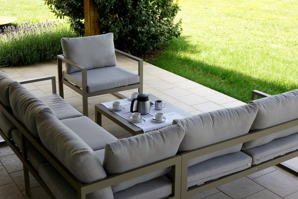 Covered terrace with lounge seating and fixed BBQ for outdoor dining