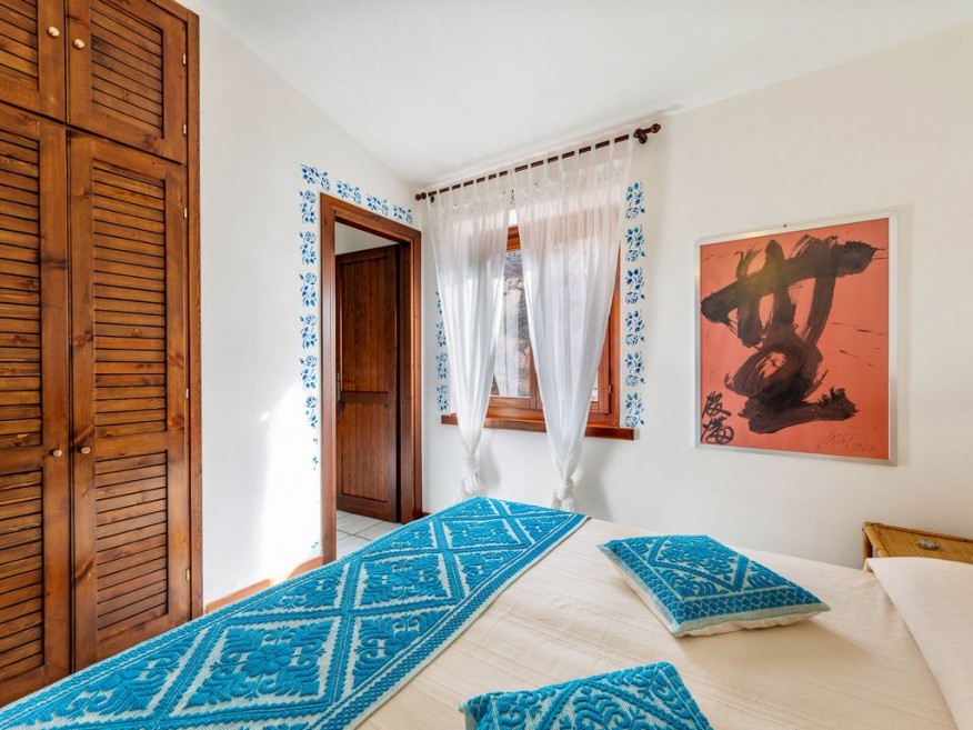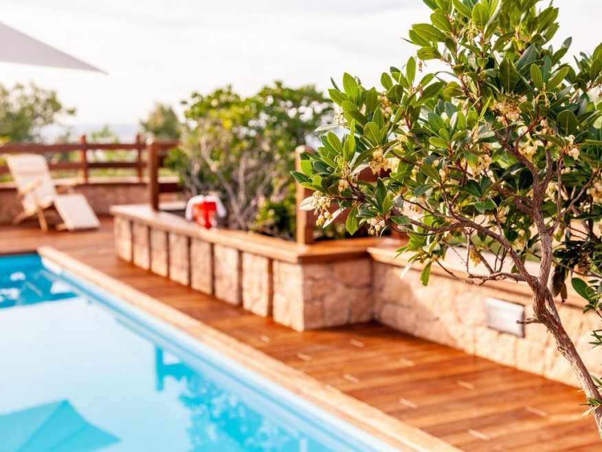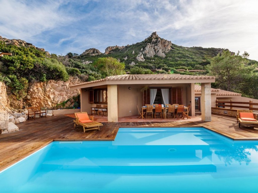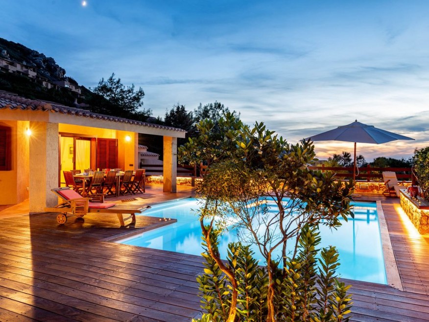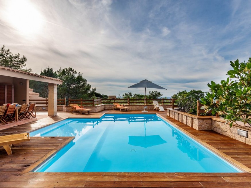 Disposed on a ground floor level with some steps inside to reach the different rooms, it consists of 6 bedrooms each with private bathroom, a large living room with a big fireplace and different relaxing areas with sofas and a flat-screen TV. From here there is a door that opens to an equipped patio overlooking the garden. The living room leads also to the separate dining area furnished with a big table and a door opens to another outdoor covered patio. A small fully equipped kitchen is available to prepare meals. The style is rustic, with terracotta floors and exposed wood beams on the ceiling. From here a step leads to the first floor where there is a small sun terrace with sea view. For sure the outdoor area with the big swimming pool are the most important points of this Villa as also the location. Fantastic dinners can be organised outdoor to enjoy relaxing evening.