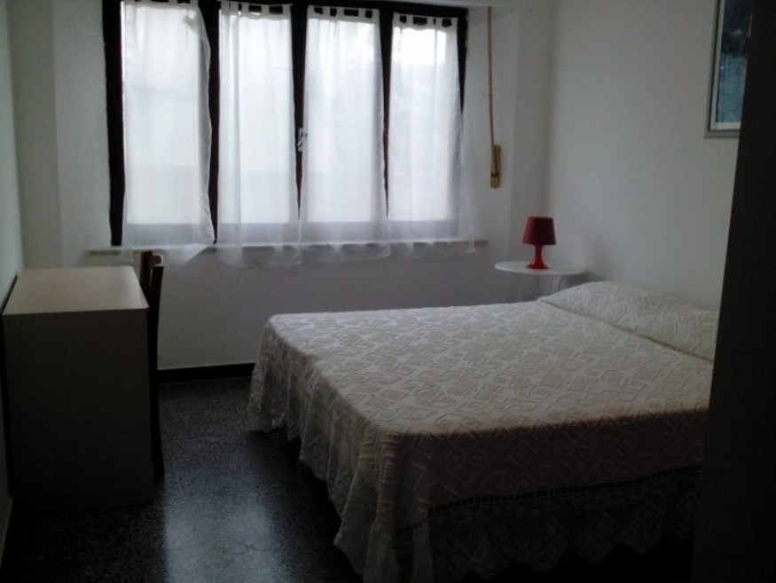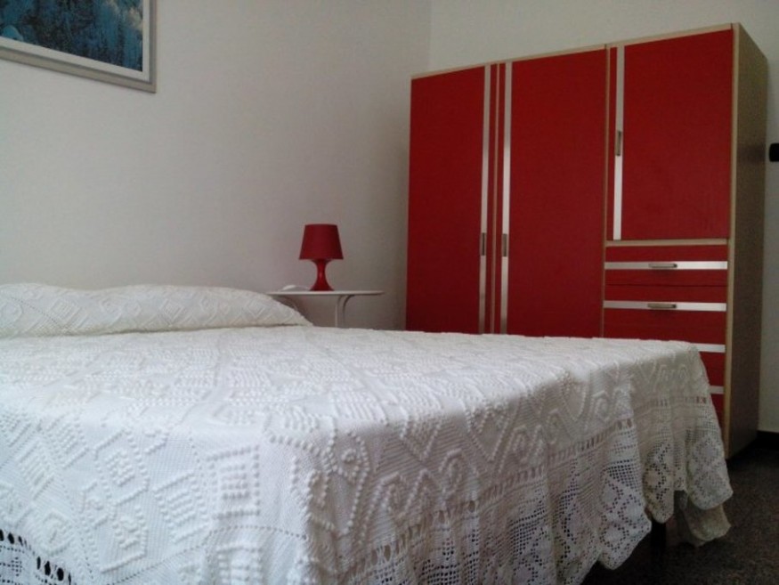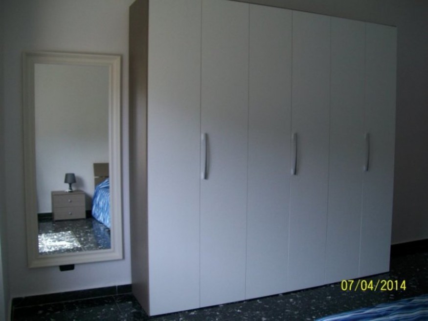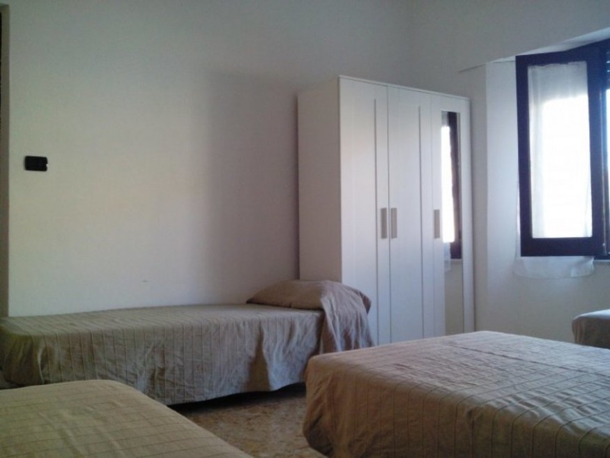 Three bedrooms for a total of eight persons. First bedroom with double bed with dresser, bedside tables and a six doors wardrobe. A smaller bedroom with two single beds, a desk and wardrobe. Another bedroom with four single beds and bedside cupboard.