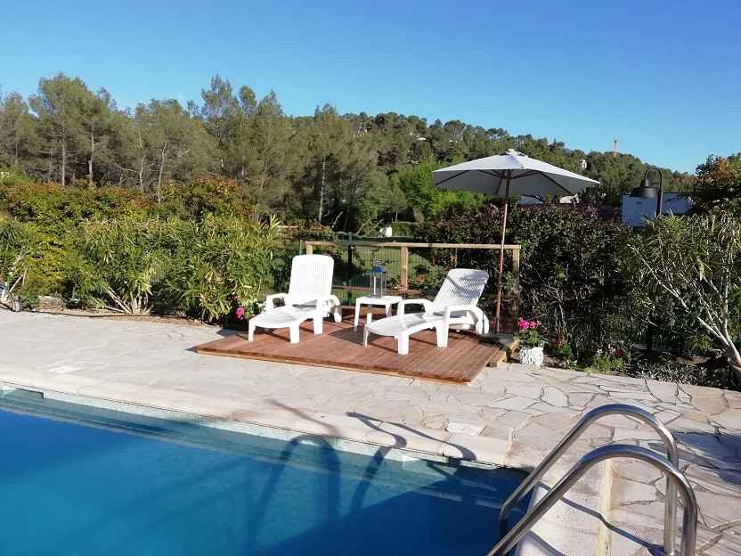 Escape to a peaceful retreat at the end of a quiet lane—this spacious 140m² single-storey villa plus a charming 28m² independent apartment comfortably hosts up to 7 guests. The main villa features 3 cozy bedrooms, a bright living room, two bathrooms (including a separate toilet), a fully equipped kitchen, and laundry facilities. The independent apartment includes its own bedroom, shower room with toilet, living space, and kitchenette—ideal for added privacy.