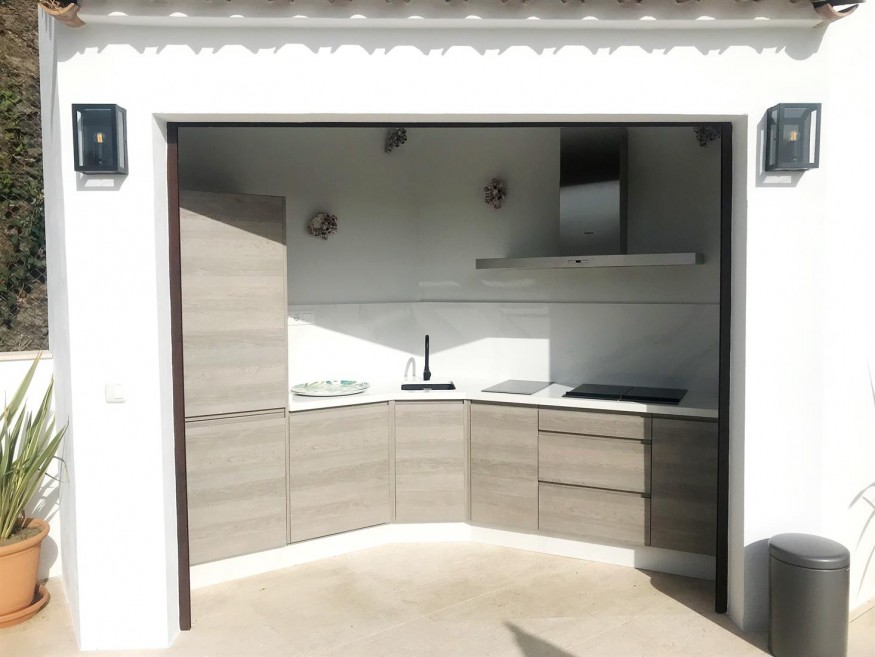 The exterior pool area is breathtaking, with large terrace and outside kitchen. Luxurious sun beds and garden furniture are arranged next to the fabulous pool.