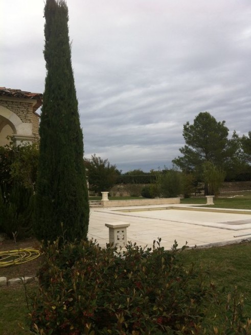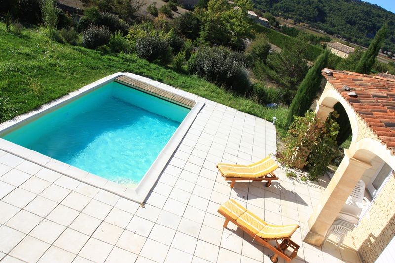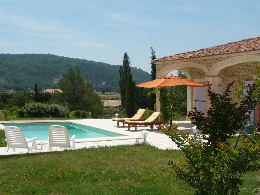Private swimming pool with sun loungers and a shaded garden lounge area