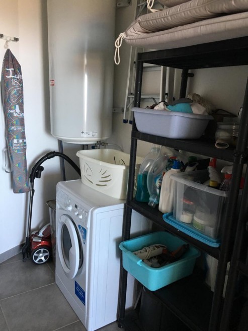 A separate utility room includes a washing machine, dryer, ironing board, and iron.