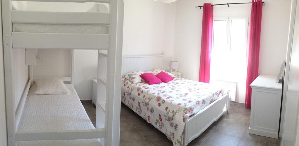 Family Room: Double bed (140x190), two bunk beds (90x190), nightstands, large wardrobe, and chest of drawers