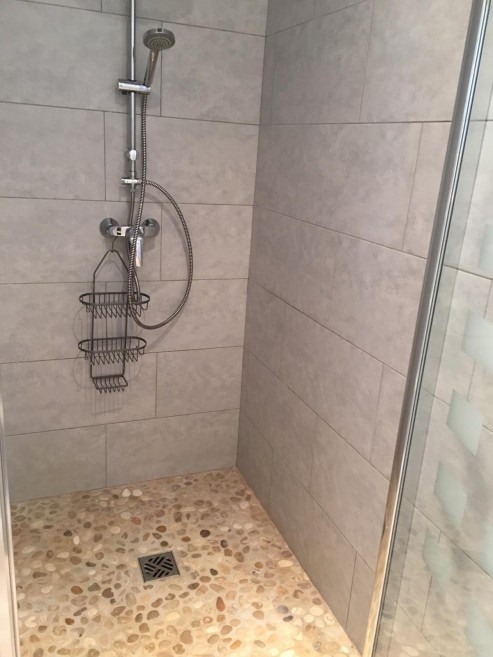 The bathroom features a walk-in shower, scale, and hairdryer, with a separate toilet for convenience.