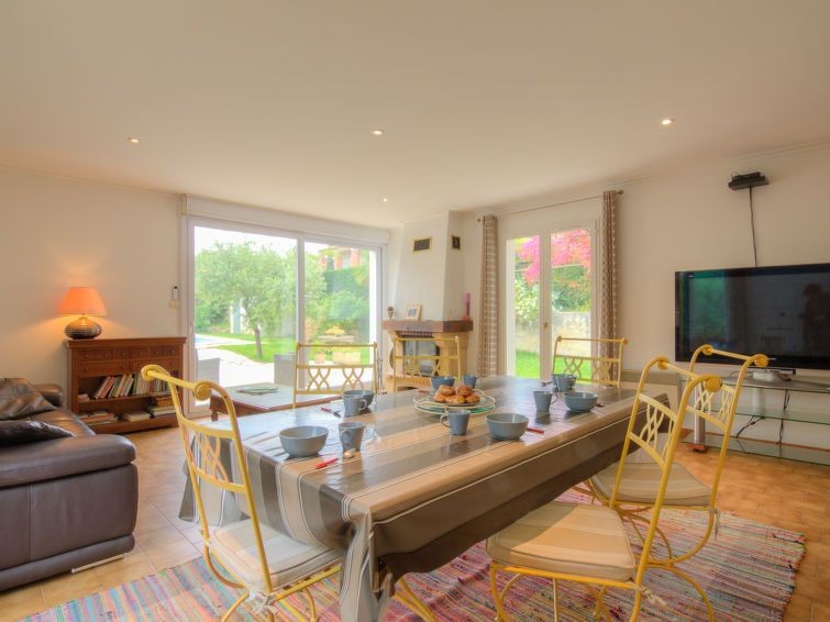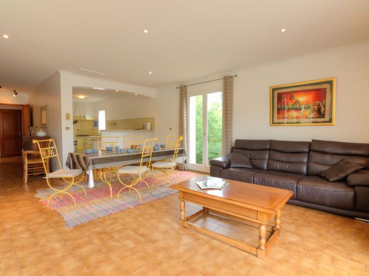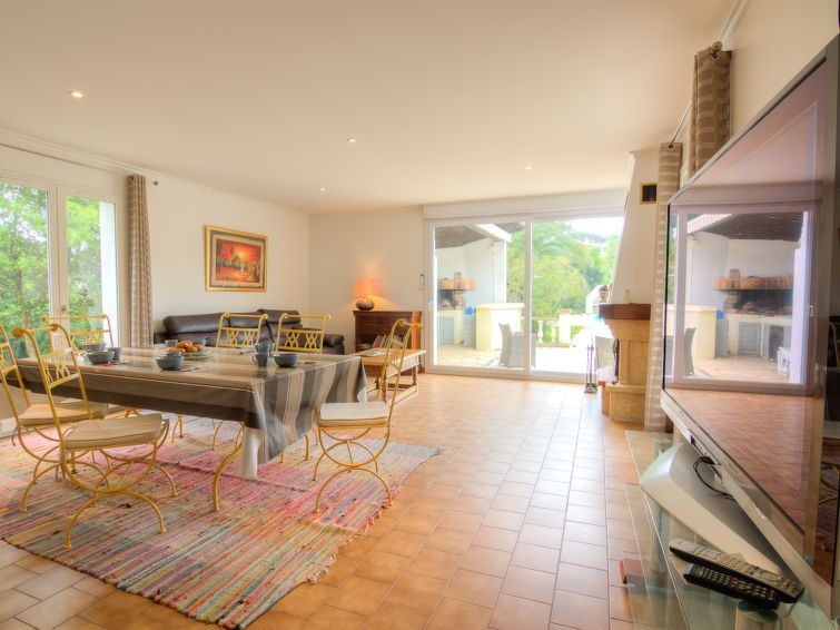 5-room villa 130 m2 on 2 levels. Nice furnishings: dining room with open fireplace and TV. Exit to the garden, the terrace, the pool. 1 room with 1 french bed (140 cm, length 190 cm), separate WC and shower. Open kitchen (4 hotplates, oven, dishwasher, micro wave, freezer). Upper floor: 3 rooms, each room with 1 double bed (140 cm, length 190 cm). Bathroom, sep. BATHROOM. Large terrace, south facing position and west facing position. Facilities: washing machine. Internet (WiFi, extra). Please note: smoke detector.