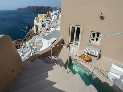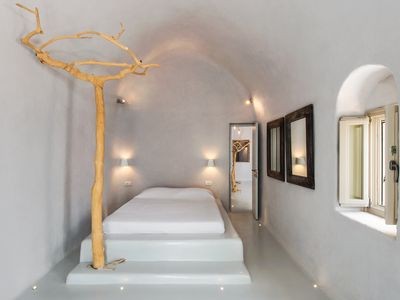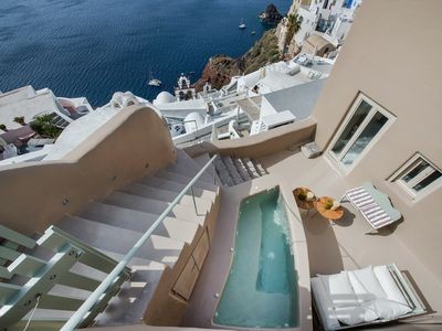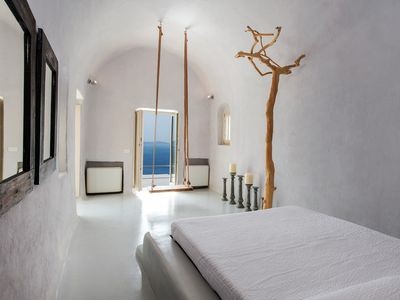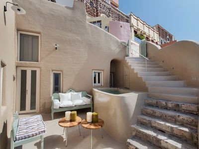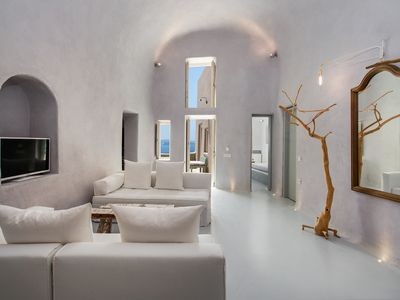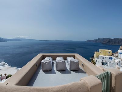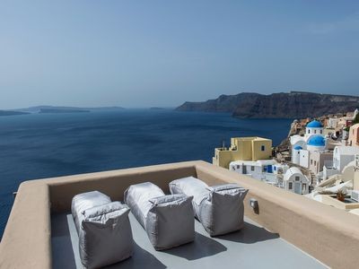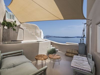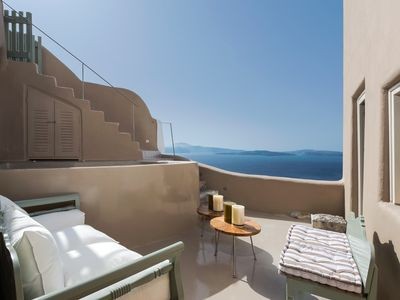 The property's beautiful terrace offers an uninterrupted idyllic view of all the caldera bay, volcanic islets and the aegean sea as well as the nearby islands.