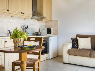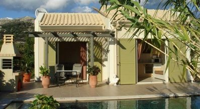 Accommodation: open-plan studio style design with bedroom (double) bathroom (shower) and open kitchen/dining/living area; gardens, pool (7m), BBQ.