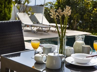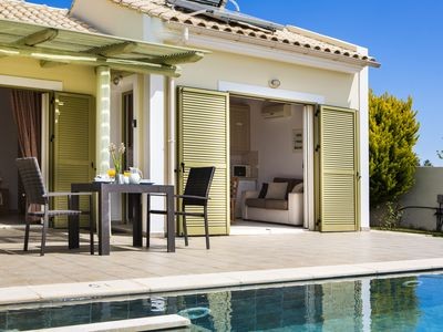Inside, this modern, compact little hideaway for two is all on one floor and has a completely open-plan design, with no separation between the kitchen/diner/lounge area and the double bedroom and shower room. The villa is fully air-conditioned and living area offers TV, DVD player and wifi. Outside the pool (with Jacuzzi) is a useful 7-metre size and the gardens and patio area provide ample space for both sun-bathing, with a pergola and parasols providing shade, and alfresco dining from the BBQ.