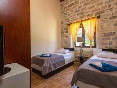 A large, beautiful open space, modernly and discreetly decorated, welcome you as you enter the Villa. There guests can find the cosy living room featuring an enormous sofa corner sofa for the whole family, where you can relax and have fun watching your favourite movie. Besides the siting area, there’s a chic, white dining table for six people , right next to fully equipped kitchen, ideal to prepare your homemade meals! The whole Villa is highlighted by the stone walls, the carefully chosen decorative elements and the wooden ceilings, which create a beautiful ambience. We shouldn’t forget to mention that glass doors from the living room, dining area and the kitchen lead to a large, perimetrical veranda, as well as to the pool terrace and BBQ facilities, giving you easy access in and out of the Villa. A shared, family bathroom with shower cabin is also available on this level.