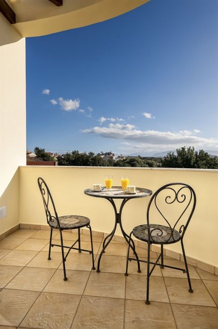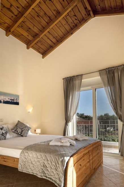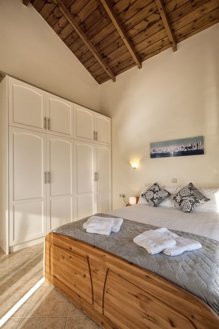 The villa has lovely sea and mountain views. It has 2 bedrooms upstairs both sharing a tiled shower room and has a lovely curved balcony overlooking the sea and white mountains. The main bedroom has a wonderful open pitched wooden roof and a double bed. The second bedroom has 2 single beds. Each bedroom has built in wardrobes with hangers.