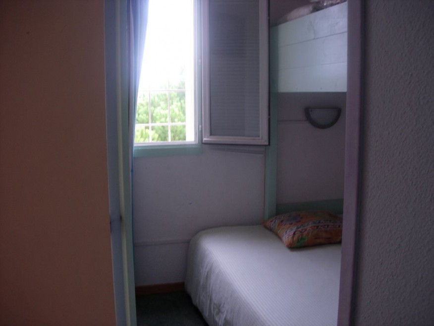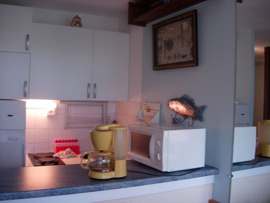 Apartment of 29 m², 1 bedroom with 1 bed for 2 people and a bed in mezzanine for 1 person, sofa bed 2 people in living room, electric heating, bathroom and separate WC, living room with TV, kitchenette, kitchenette equipped with 'a hob, a mini oven, a microwave, refrigerator with freezer, coffee maker, crockery, cutlery, utensils and cookware.