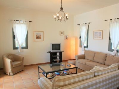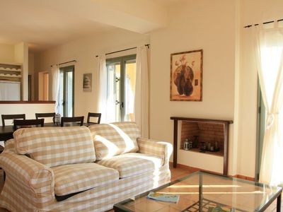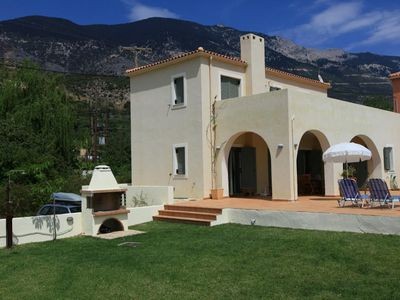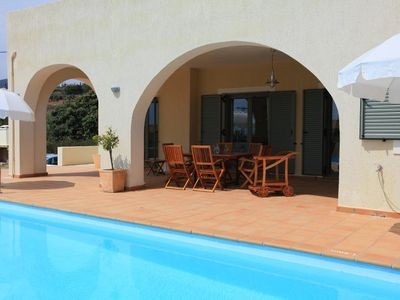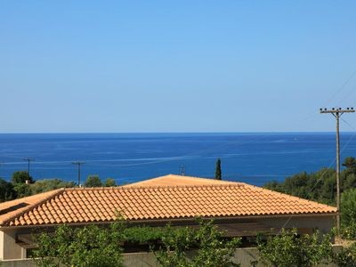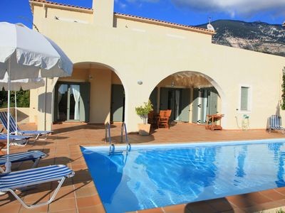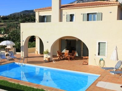 Outside the villa, within an arched and shaded terrace, there is a wooden table and chairs for al fresco dining by the swimming pool with lovely views of the surrounding countryside and attractive bay of Trapezaki. (On a clear day the island of Zakynthos is also visible.)