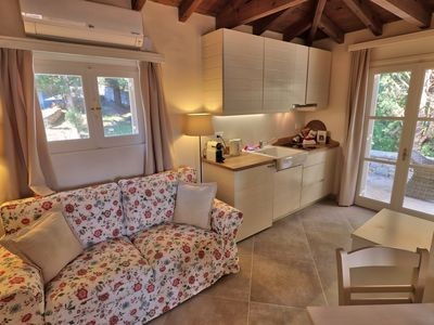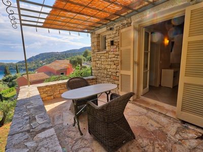 Cottage with kitchen/living/ bedroom and bathroom. Living/kitchen opening up to large balcony with beautiful sea view.