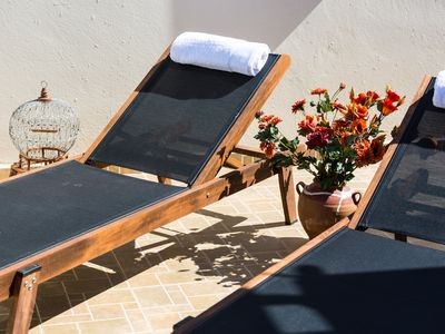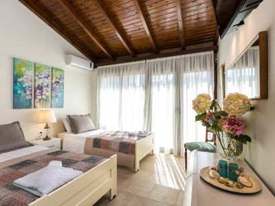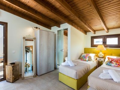 Reaching the attic from a staircase from the dining area, there is the second master bedroom with a double bed and an en-suite bathroom with shower. The bedroom opens to a spacious balcony with sitting area which is the perfect spot to enjoy panoramic view and sea breeze. Going through the master bedroom, there is another smaller bedroom again separated by a door with 2 single beds which can be transformed to a double one if it is needed. This single bedroom have direct access to a balcony with two sun beds.