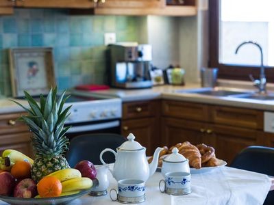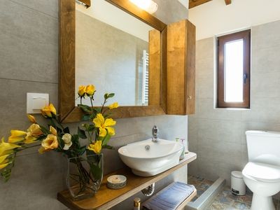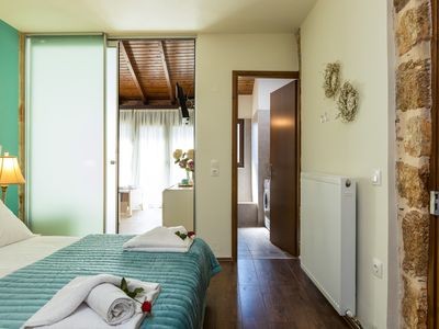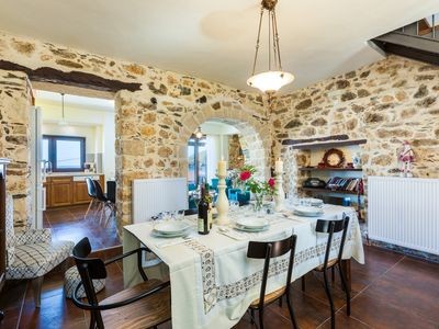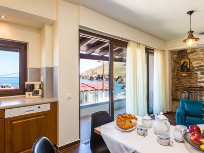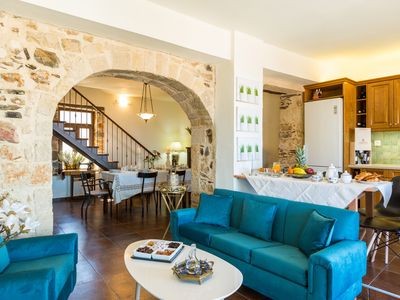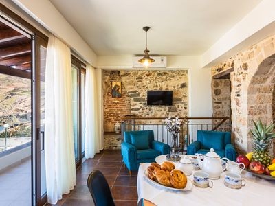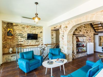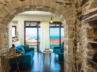 Entering the house from the main entrance on the ground floor, a staircase leads you directly to the first floor where a spacious open plan area is located. The area consists of a living room area with a sofa, satellite 49" HDTV and Playstation 4, a dining area and a fully equipped authentic kitchen. From the living room area, you have direct access to a balcony which offers exceptional views of the Cretan sea.