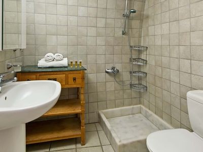 The private outdoor area is a spacious deck- veranda equipped with patio furniture and a stone built couch and is ideal for dining, relaxing and sunbathing.