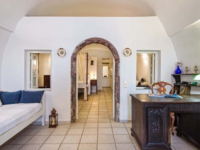 Adam and Eve is a unique cave villa located at the village of Imerovigli. The villa has a personality of its own as it is furnished with antique and contemporary pieces, setting the scene for a romantic and relaxing atmosphere.