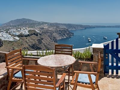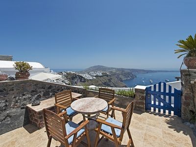 The location of Adam & Eve villa is unique. It is built high on the Imerovigli caldera and can be easily reached from the main road of the village. Due to this fact, guests can enjoy a panoramic view of the Island. The veranda overlooks the caldera of Imerovigli and Fira, the volcano and volcanic islands and the view extends as far as the southern part of the island and the villages of Kamari and Pyrgos.