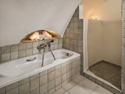 Adam and Eve is ideal for newlyweds as their honeymoon destination, or for couples who desire a spacious villa with privacy. The master bedroom is at the back of the villa in order to provide comfort and peacefulness to its residents. It has an en suite bathroom with bathtub and unique style. The villa has also an intermediate room with a double bed and a second bathroom with shower. The living area is spacious with a dining table, two sofas and a desk.
