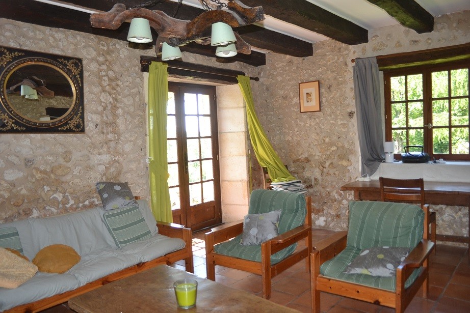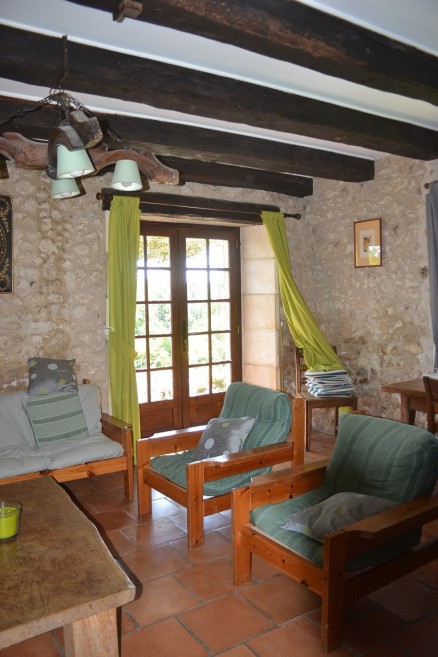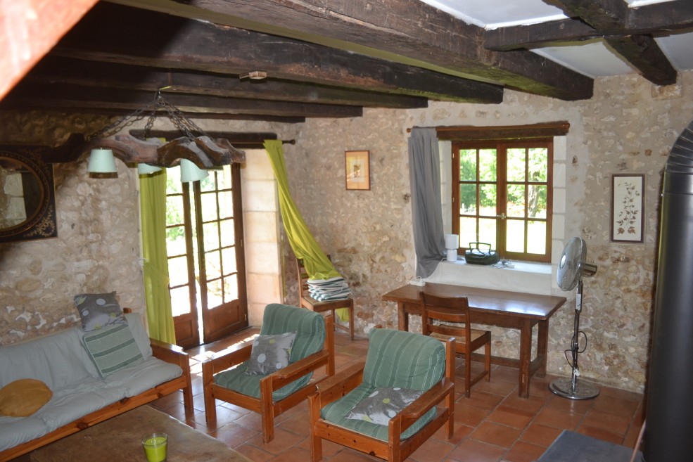 In the living room, two sofas and two armchairs face a Norwegian wood stove for the cooler months. Double doors lead to the covered terrace facing the fields where guests can dine outside and enjoy a barbecue. A door connects to the downstairs shower and laundry room which also has a toilet.