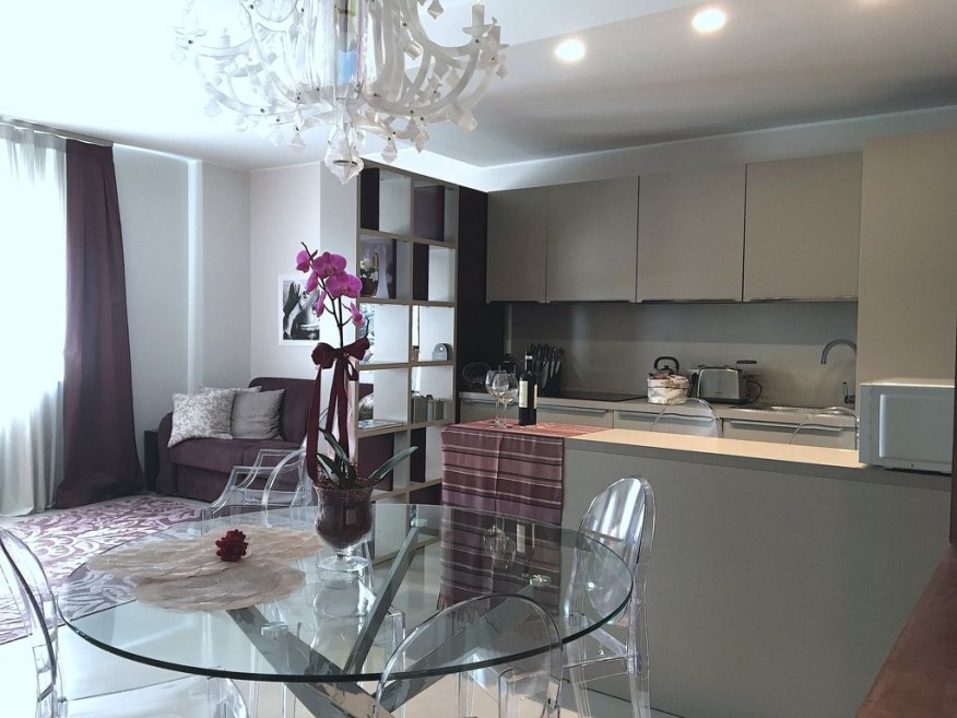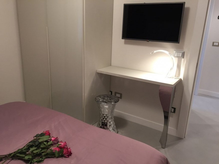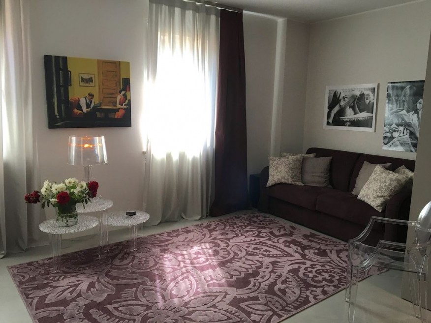This one-bedroom apartment overlooks a fine flowery small garden, and it features a spacious living area with a double pull-out sofa bed (140x200 cm), a fully equipped open-plan kitchen, and a table for six. The double bedroom has a king size bed (180x200 cm), that we can make also as two wide twin beds. In the small corridor you find a full bathroom with shower. Everything in the apartment - tableware, linens, appliances, etc. - is brand new and chosen with the utmost care to create a chic and charming ambience.