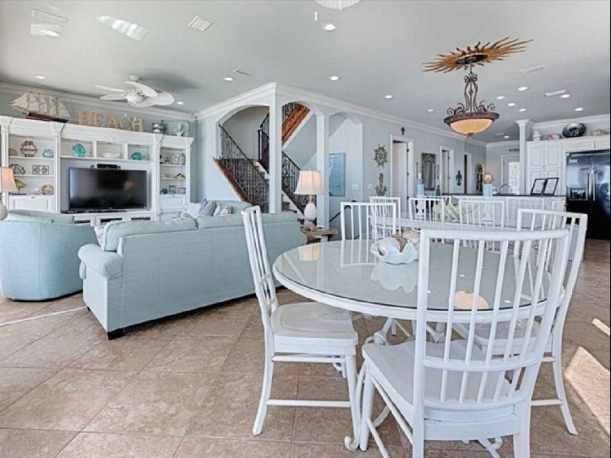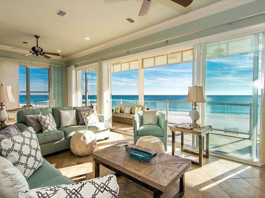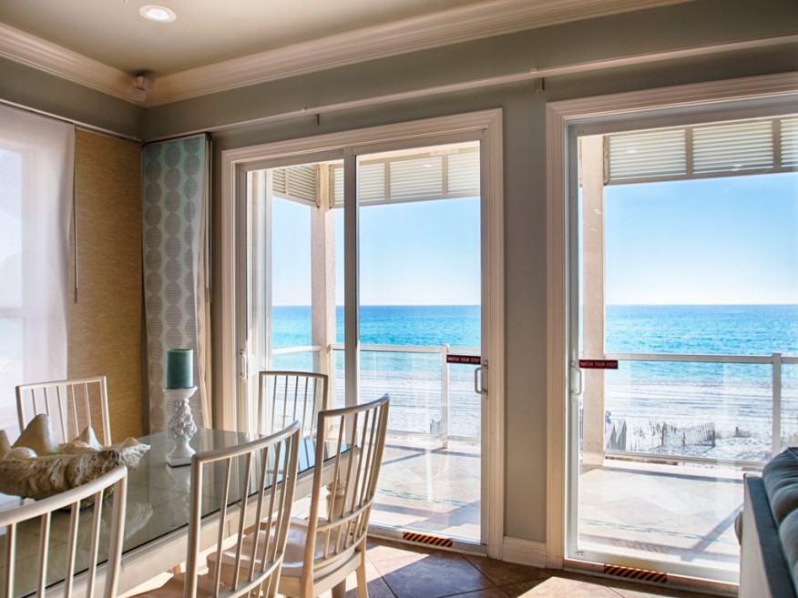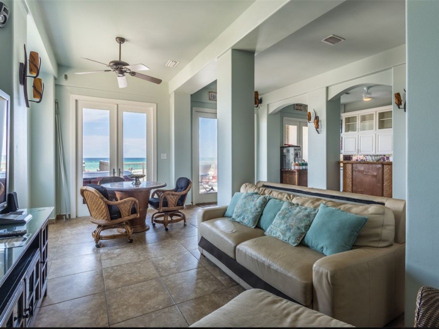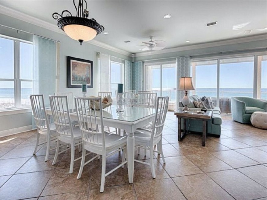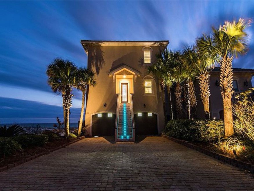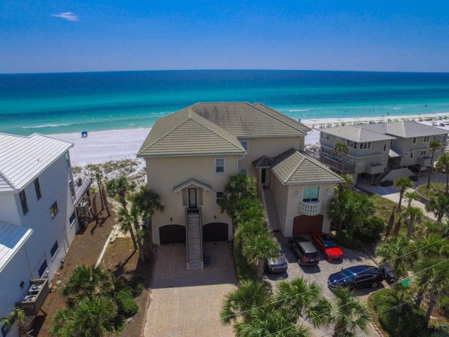 Step out of your patio door onto the gracefully tucked white powder sands, lazy sea oats and sweeping views of the shimmering turquoise waters in the serene Old Florida neighborhood of Gulf Pines, just 5 minutes east of Destin. Styled in elegant grandeur, this three level luxury beachfront retreat comprises over 4000 square feet with 8 bedrooms and 6 baths sleeping 26 comfortably on a private beach. Watch the dolphins or fall asleep listening to the waves from any of the 3 levels and travertine decks. Upon your entry, the living area is spacious and beautifully decorated with colorful sleeper sofas and 2 swivel chairs to delight in an unobstructed picture from the glass-front balcony with views of the Gulf from almost every corner. The family gathering space was built for entertainment with a home theatre that includes a Bose speaker system, Blu Ray player, and a 55” high definition television. The formal dining area seats twelve, while the open kitchen features granite countertops throughout with additional seating at the bar for four. Cook like a professional with modern Viking appliances while enjoying breathtaking views of the Gulf, and bring your favorite wines to the perfect temperature in the 12 bottle built-in wine cooler. This floor is furnished with two queen bedrooms, two full baths, one en-suite. Additionally, a separate bunk room with 4 twin beds. Each bunk bed has its’ own light and flat screen tv. Upstairs, you’ll find 3 master suites, two with beach views, including one with a private glass-front balcony and sleeper sofa for children at night or in the afternoon to curl up and enjoy reading a good book overlooking the blue waters. The two masters have king beds and generous baths, one that boasts a large, jetted soaking tub. For the kids, a separate bedroom offering new full size bunk beds direct from the Pottery Barn and a Jack and Jill bathroom. The first floor level provides private beach access, including a gas grille, a fully appointed second living area and game room complete with a full sleeper sofa. The kitchenette provides the convenience of a refrigerator, microwave, built in icemaker, separate beverage cooler and an extended wet bar for family gatherings. A second 55” television gives everyone plenty of room to spread out and enjoy their favorite shows, sporting events and movies. Cable TV and wireless WIFI are available in all the bedrooms, great room, kitchen, study and game room. First floor is complete with a laundry center with washer & dryer, full bath with walk-in shower and a bedroom with a queen size bed and stunning beach views. Exquisite beachfront luxury awaits you! Was lack of sufficient parking a problem in the past or tight spaces on a busy gulf front street? No need to worry! This home has a private double driveway on a cul-de-sac street, which accommodates parking for large families or parties on the beach! Come and unwind. Enjoy the tasteful and distinguishing features this home has to offer, and take home memories of a beautiful private beachfront paradise that you’ll never forget! The Gulf Pines community has a catch and release stocked pond for guests within a short walking distance! This property is located near Destin and Sandestin, Florida, just minutes from The Village of Baytowne Wharf, Sandestin Golf, Beach Resort and Silver Sands Factory Outlet Mall, Destin Commons, local churches, Big Kahuna's Water Park, and Harborwalk Village in Destin.
