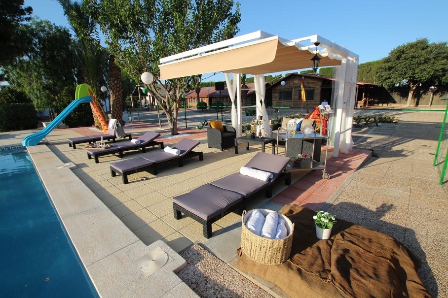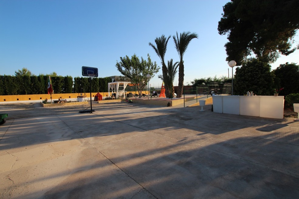 It has a celebratory room for 90 people with disposable chairs and tables, sunbeds, a large 305 cm x 215 cm trampoline with 270 cm net, slide, seesaw, pin table, table football, pool table, gym, swings , barbecue plates, toys for children, bicycles, basketball baskets, football goals, two fireplaces.