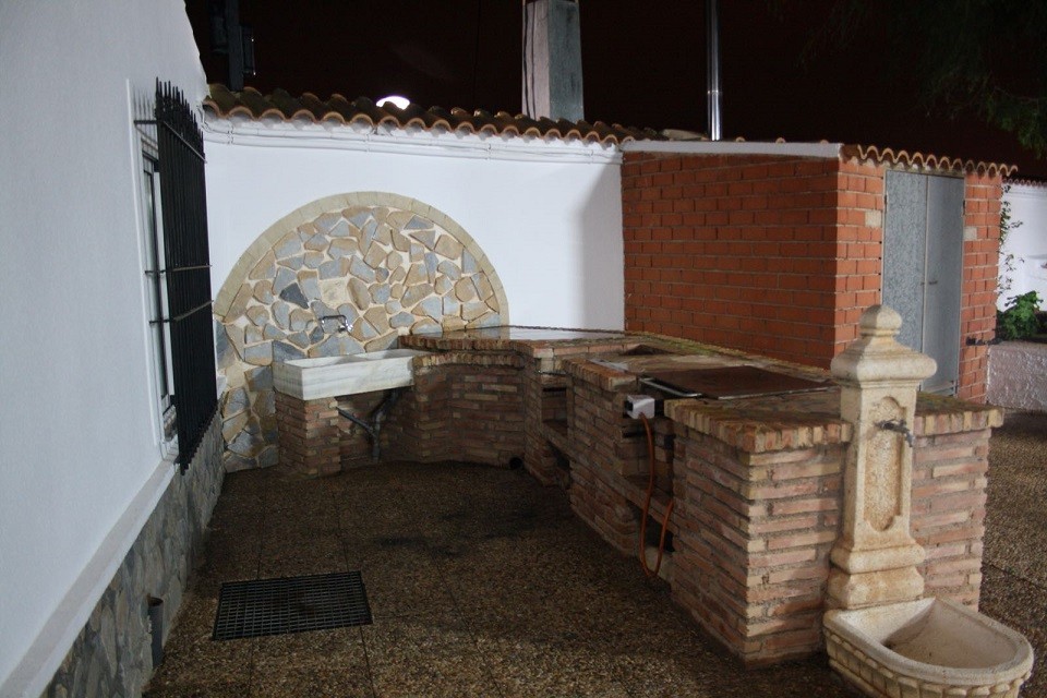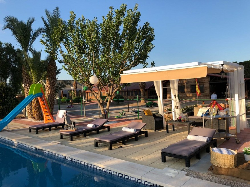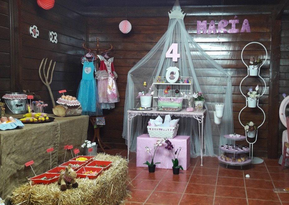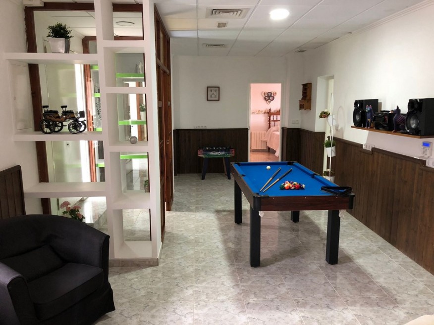 It has a celebratory room for 90 people with disposable chairs and tables, sunbeds, a large 305 cm x 215 cm trampoline with 270 cm net, slide, seesaw, table pin, table football, pool table, gym, swings, barbecue plates, toys for children, bicycles, basketball baskets, football goals, two fireplaces.