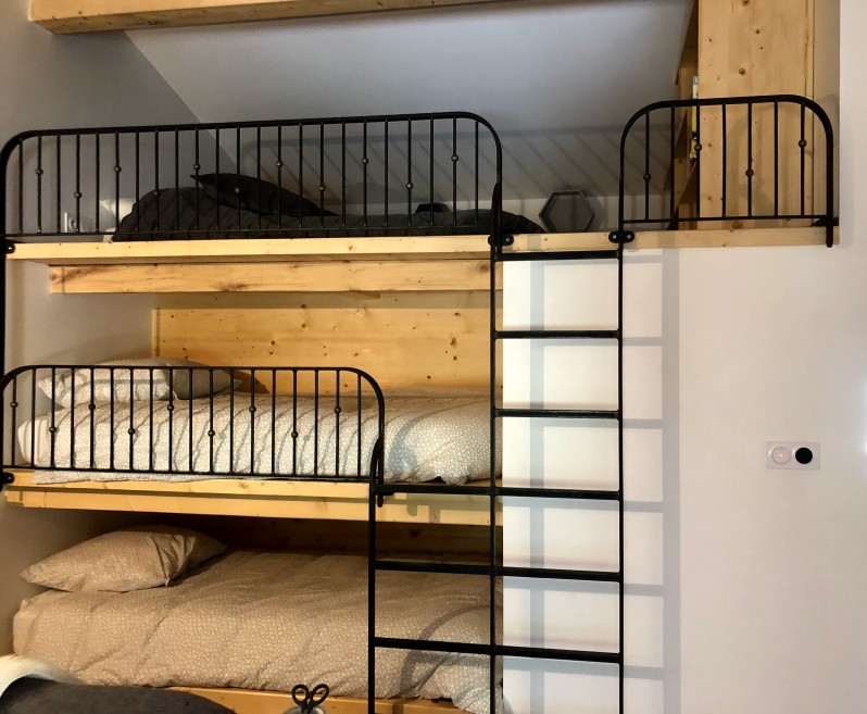 - 2 bunk beds (90x200) with a large mezzanine offering you a bed (140cmx200cm)