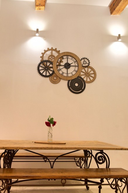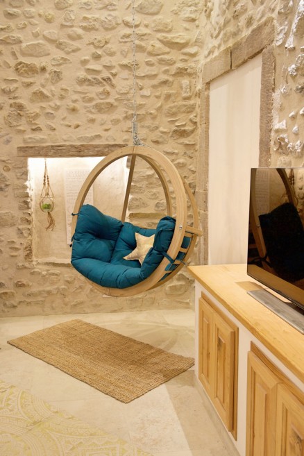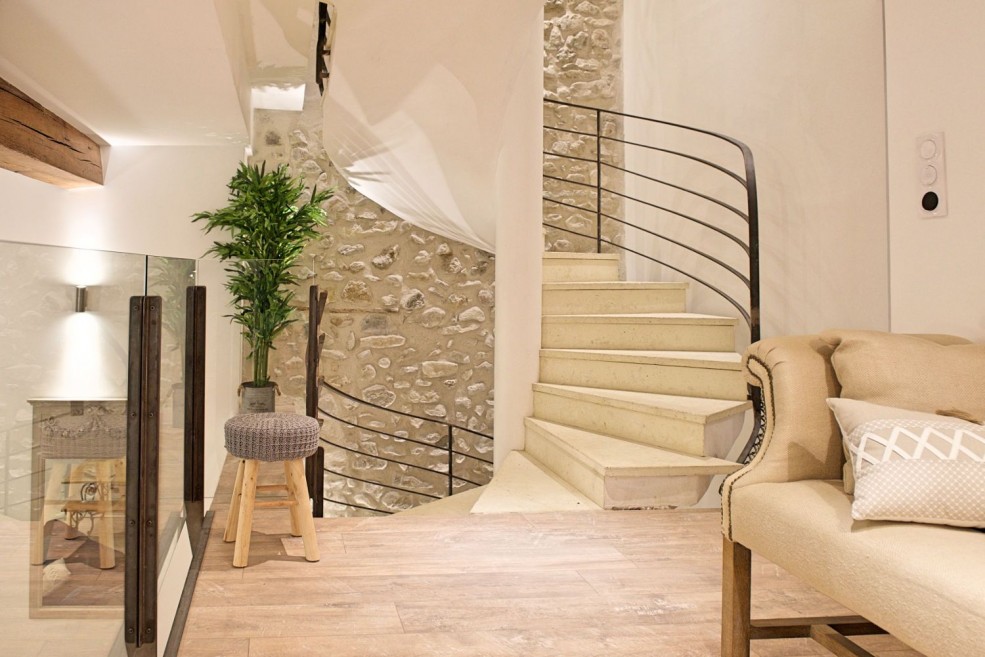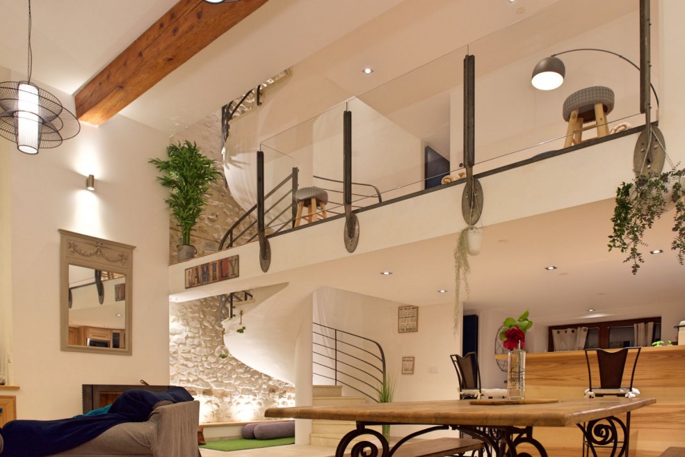 After crossing the castle courtyard, you climb the vast stone staircase. After opening the main door, you enter in the living room: beautiful high ceilings, exposed stone walls, double helical staircase: the architecture is unique.