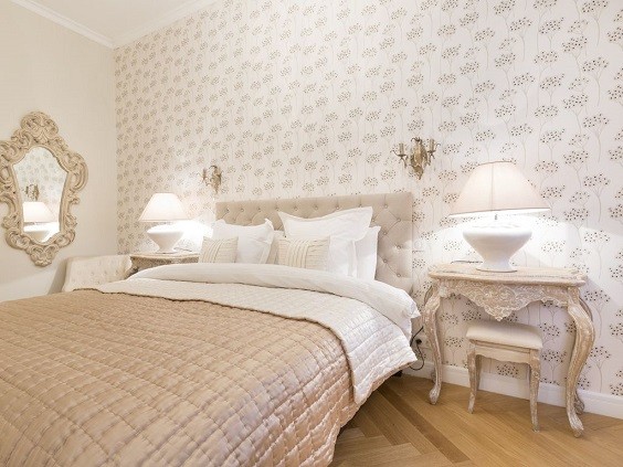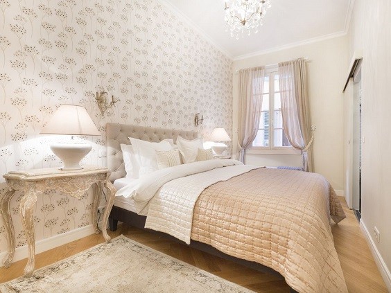 Bedroom 1, adorned with soft floral wallpaper and cream curtains. Spacious and cozy, it is elegant with an elegant chandelier, rococo style bedside tables, wall mounted reading lights and an extra large (190 cm) British king-size bed. The last essential of this room is the closet that offers plenty of storage for your clothes and suitcases.