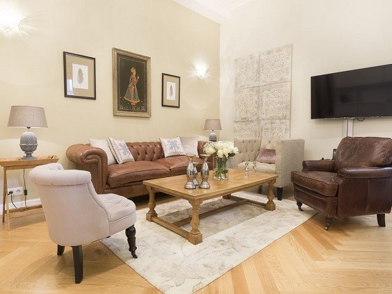 The atmosphere is both stylish and comfortable, with a mix of soft upholstered chairs and sofas. The antique style leather sofa rests next to the wall mounted flat screen TV and can be the ideal place to relax.