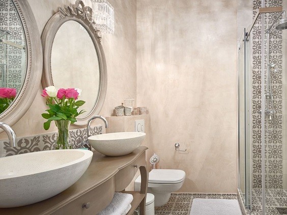 The 2nd bathroom with a toilet also offers the marble sinks and hers in a Provencal vanity unit, above each basin is an ornate wall-mounted mirror. The elegant walk in shower offers rejuvenation at the end of the day.