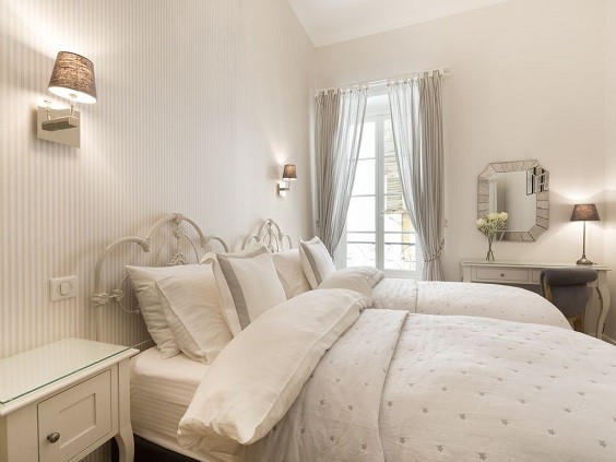 The third bedroom is fresh and airy with French lights and white and white wallpaper. It has a vanity table and two single beds (90 cm) and a double-bed wardrobe. Double size feathers making it ideal for children or friends to share.