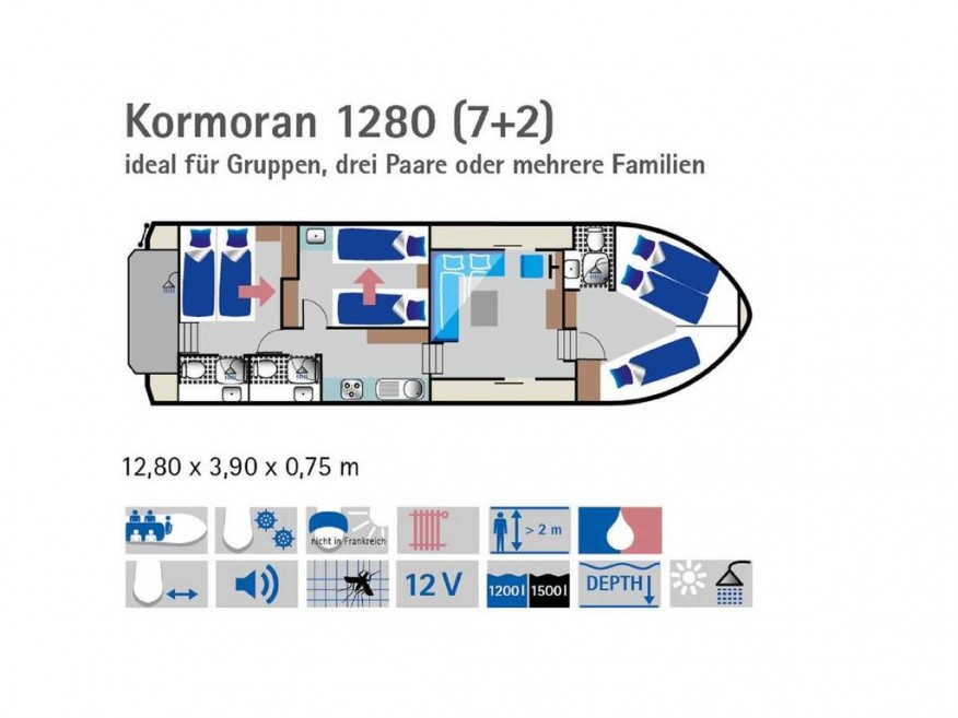 This modern traditional-style boat house is easy to maneuver and offers all the comfort above and below the deck. It is ideal for three couples or more families. 9Cabine 3Bathrooms 3 Beds