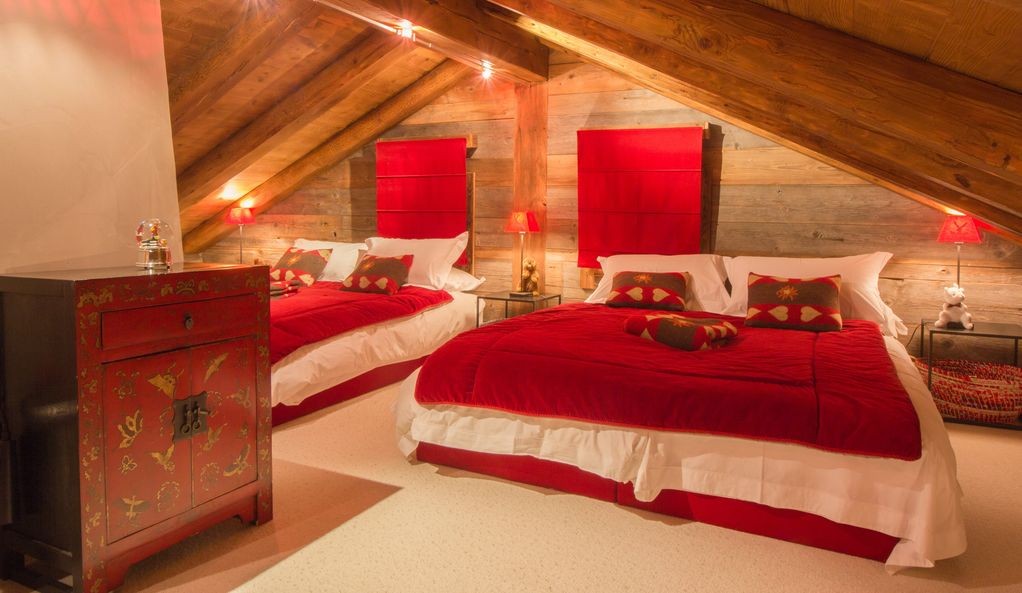 A large open-plan, bedroom in the eaves of the chalet that sleeps up to four people in either two doubles or four single beds with an ensuite bathroom with bath and shower