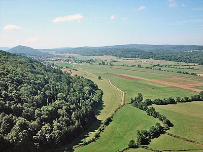 Bois de Ban, at 2000 ft, is situated on a ridge with views to the east extending as far as Mont Blanc (85 miles away) and in between the succession of north-south folds of the Jura mountains culminate in the Crêt de la Neige at 6000 ft.